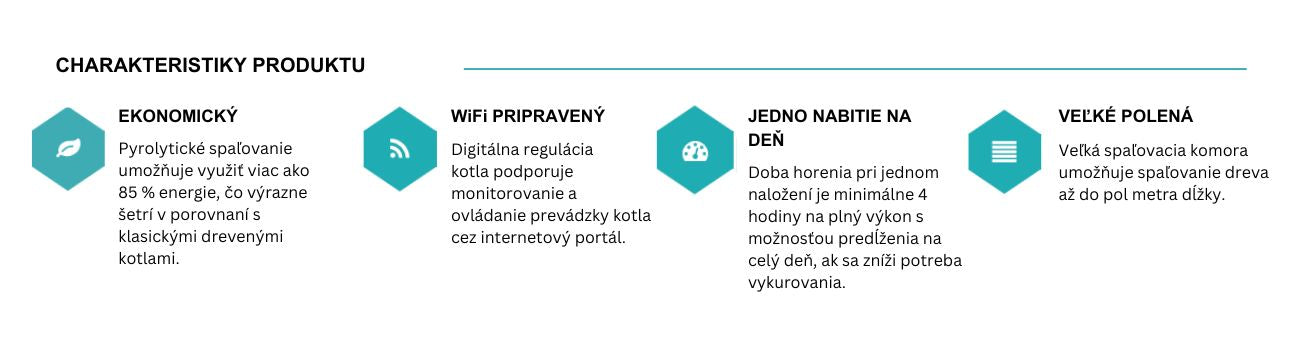 Princíp pyrolýzy dreva zabezpečuje úplné spaľovanie paliva a minimalizuje obsah nečistôt v kotli. Doba horenia jedného naloženia sa pohybuje od 4 hodín pri maximálnom výkone, zatiaľ čo pri nižšom teplotnom odbere môže byť horenie rozložené takmer na celý deň. Kotol je environmentálne šetrný vďaka extrémne nízkej koncentrácii škodlivých častíc v dymovode. Tri veľké dvierka do spaľovacej komory umožňujú jednoduché čistenie a údržbu. Integrovaný ovládač s dotykovým displejom zaisťuje vysoký komfort a ľahkú ovládateľnosť. Kotol je určený na pripojenie k otvorenej alebo uzavretej vykurovacej sústave len s vhodnou akumulačnou nádržou.
